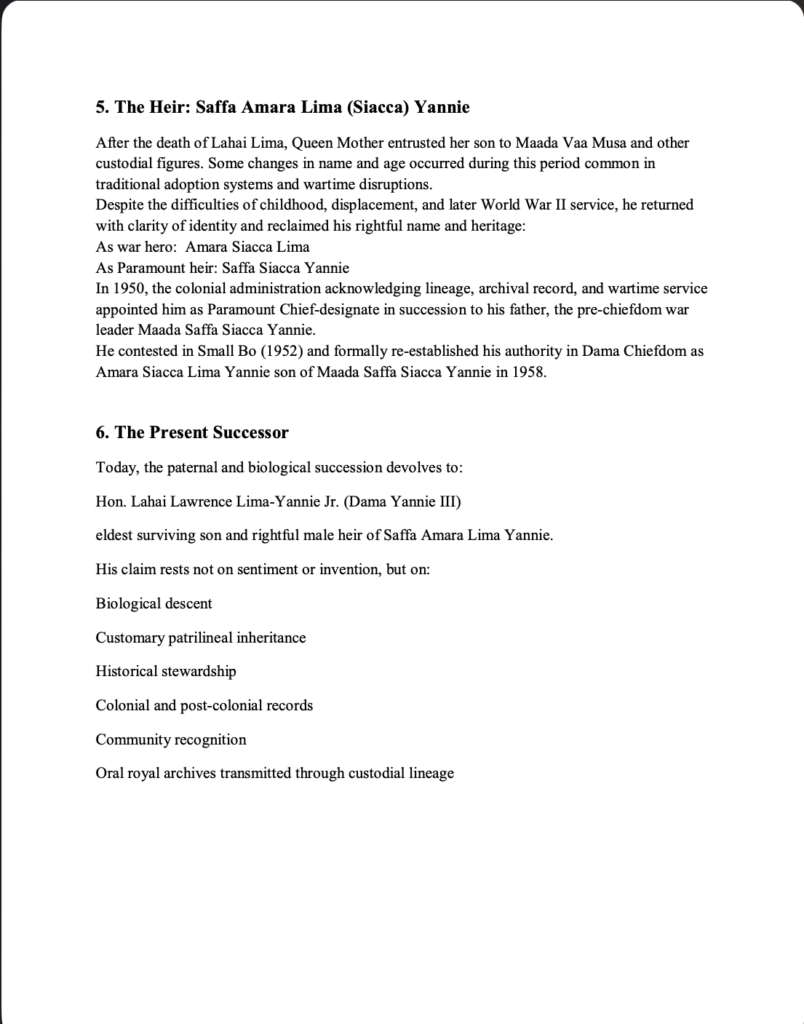 The statement, signed by Hon. Lahai Lawrence Lima-Yannie Jr., aims to set the historical record straight and confirm who is recognised as the rightful heir of the Dama Yannie authority.